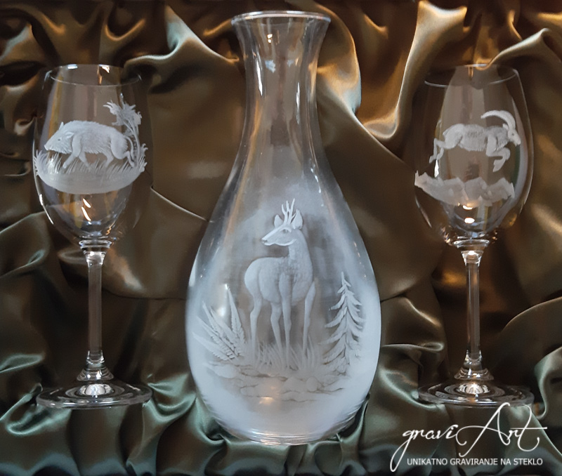 Steklenica in 2 kozarca za vino – lovski motiv.