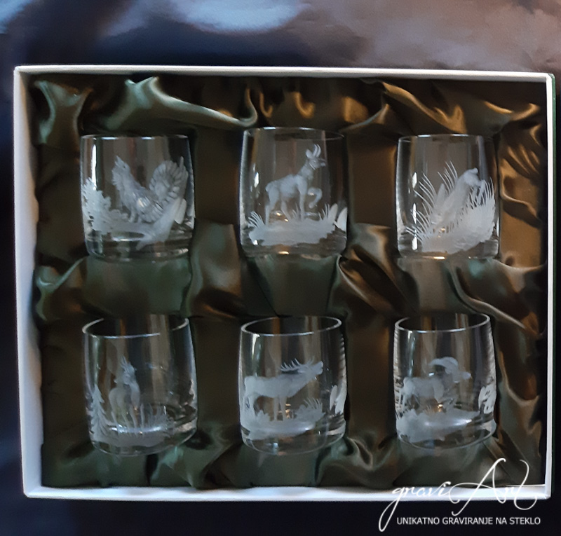 Komplet šestih (6) žganjarčkov z lovskim motivom.